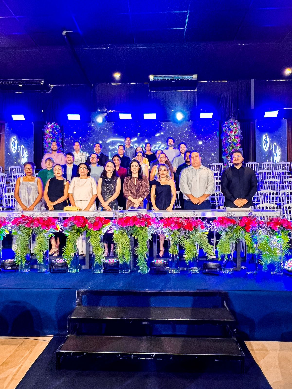 A solenidade começou com a entrada da diretoria, incluindo Marcela e Camila Rangel, os coordenadores pedagógicos da 3ª Série do Ensino Médio, Anne Rangel, Joacir Filho e Sandra Reais, seguidos dos professores e colaboradores homenageados, refletindo a importância do momento.